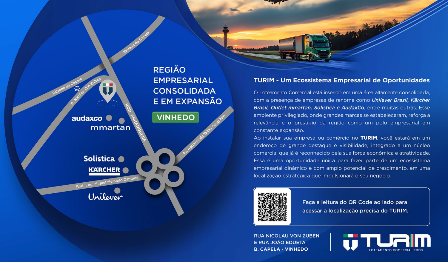 Ο TURIM está estrategicamente localizado na cidade de Vinhedo.Um empreendimento comercial exclusivo, localizado às margens da Rodovia Anhanguera, ao lado da M. Martan, com acesso rápido, visibilidade privilegiada e total infraestrutura. Apenas 18 km do Aeroporto de Viracopos e 22 km de Campinas, TURIM está no coração do desenvolvimento econômico da região.